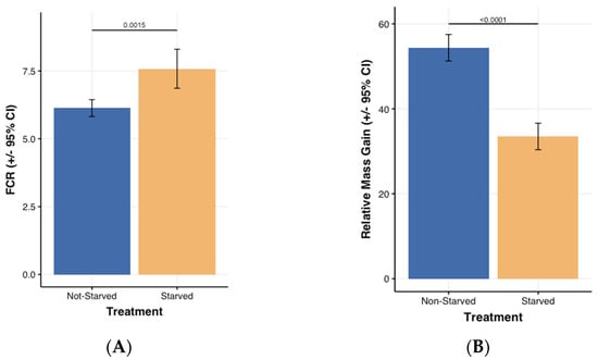 The half normal plot identified starvation as the single factor affecting relative larval mass gain. Figure 3A shows that larvae mass relative gain (F1,14 = 103, p < 0.0001) as expected was higher (54%) in the non-starved group compared to that in the starved one (33.5%.) Similarly, half normal plots indicated that starvation impacted FCR. The starved larvae had higher FCR than the non-starved ones did (6.13 vs. 7.58; t = −4.38 and p = 0.0015; (Figure 3B).