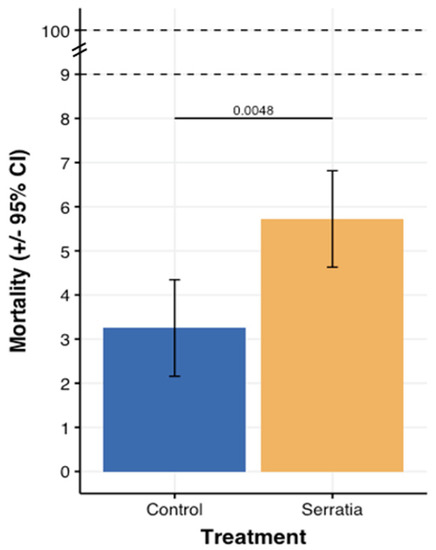 Larval mortality after 24 days, “Control” corresponds to the cups without the addition of Serratia to the feed while “Serratia” indicates the cups in which the bacterial culture was added to the feed at the beginning of the experiment.