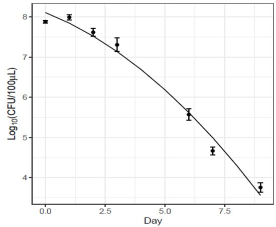 An alternative Sm detection method was sought using an erythritol-based selective substrate for the growth of Sm [22]. This medium contained 0.5% erythritol as the sole carbon source and allowed the growth of only Sm and principally no other bacteria. Sm overnight cultures at 6 × 1010 CFU/mL (OD420 = 9) were used to soak the wheat bran; 6 × 109 CFU (100 µL) was mixed with 80 mg of wheat bran. Twenty-one replicates in Petri dishes were placed in an incubator at 30 °C. Each following day (7 days for a period of 9 days), three replicates were analyzed by mixing the 80 mg bran with 500 µL of physiological water. One hundred microliters of the suspension were spread on erythritol medium plate, and bacteria outgrowth (CFU) was counted after 2 days at 30 °C.