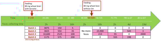 To follow the kinetics of the persistence of Sm in the Tm, larvae were fed with Sm-inoculated feed. The protocol used is illustrated in Figure 7. Pathogen persistence was measured in the feces, based on the hypothesis that if Sm was still present in the feces, following a period where larvae were provided non-inoculated wheat bran, it should indicate that Sm could remain for a certain time in Tm’s digestive tube and therefore inform about its persistence. The results are indicated in Figure 7 as the number of colonies growing on the erythritol plates from a suspension of feces. The data showed that there was a certain level of variation among batches, each containing five larvae. Sm could disappear after two days or to the opposite, survive and sometimes multiply after three days. For instance, in batch 4, Sm appeared in the feces after three days while it was not detected in the 56–72 h period. Perhaps Sm could bind to the gut and be excreted later when the larvae were fed again as observed in batch 2 and batch 3. It was not possible to separate the feces from the larvae immediately after excretion and it was probably that Tm ate feces and therefore could be contaminated again with Sm. This might explain the differences among batches, and therefore a precise (number) estimation of persistence in the larvae proved difficult. However, the data indicate the possibility that Sm can survive and multiply in a rearing system at least for a period of about three weeks.