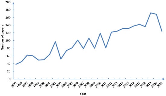 By analyzing the number of publications through the years, we could understand the research history of Neuropterida to a certain extent. Although there are both increases and decreases of the annual number of related publications from January 1995 to September 2021, they generally showed a trend of substantial growth (Figure 1). There were four times when there were distinct large increases in succession (2002, 2010, 2012 and 2019), indicating that the research of Neuropterida was relatively hot and had rapid development in the past twenty years. Among them, the number of publications in 2012 increased the most, with an increase of 41 publications compared to the previous year; however, it did not continue. The reason may be the popularity of high-throughput sequencing technology, which is used by many researchers to solve some former difficult problems. The number of publications in 2003, 2007, 2009, 2011 and 2018 decreased compared to the previous year, indicating the research entered a stable phase. In general, Neuropterida became a research hotspot and the number of publications continued to increase steadily after 2000. The number of publications in 2019 was the highest with a total of 172 publications. The reason may be that Engel et al. summarized and discussed the existing problems of phylogeny and evolution of Neuropterida in 2018, influencing the future research direction of Neuropterida [33]. For example, they suggested that we should pay attention to the in-depth study of Neuropterida using internal anatomy and fossil data. Thus, researchers have a direction for the study of Neuropterida.