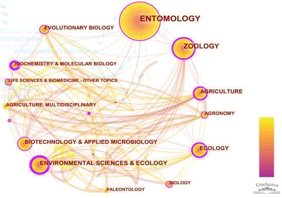 The categories were visualized to show the relationships of different subjects in this domain. Each publication was distributed to one or more subject categories. This information can be used to analyze which subjects are covered by the publications about Neuropterida. The research in the field of Neuropterida was mainly intersected with entomology and ecology (Figure 2). The thicker the line, the deeper the relationship between the two categories, and the darker the line, the earlier the relationship between the two categories was established. In addition, there was more cross-research in the fields of agriculture and biochemistry, molecular biology, chemistry and so on. It indicated that the research of Neuropterida could be covered from the macroscopic study to the microscopic study. The intersection of multidisciplinary fields put forward higher requirements for the reservation of knowledge of current researchers. This is because, before the popularization of sequencing technology, we could only study the agricultural and ecological significance of Neuropterida based on the morphological characteristics. Now, we can explain its ecological significance from the molecular level. For example, the reproduction of C. pallens was proven to be closely related to the activities of trypsin-like and chymotrypsin-like enzymes [22]. This requires us to master not only the morphological data of Neuropterida but also a series of molecular data. Environmental sciences and ecology had a lot of collaboration on Neuropterida and it lasted a long time. Among them, environmental science, agriculture and ecology had relatively high centrality. It indicated that Neuropterida had important research values in these disciplines and the degree of correlation was also high.