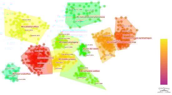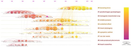 The literature co-citation network from the timeline perspective was obtained (Figure 9). It can be seen from the distribution of major clusters along the time axis that sympatric antlion and Middle Jurassic were long-term topics of Neuropterida research. The topic of lacewing larva appeared in recent years, and it continued to be a hot research topic until now. Parallorhogas pyralophagus, male-produced pheromone and fossil snakeflies were the earliest research topics. Then, studies of Neuropterida mainly focused on the behavioral, morphological and ecological significance prior to the extensive use of DNA sequencing technology. For example, Clark and Messina studied the effect of different plant structures on the predation behavior of lacewings in 1998 [53]. Hilbeck et al. studied the effects of Cry1Ab toxin through the indoor rearing of C. carnea [54]. Henry et al. explored the behavioral evolution of green lacewings by studying their courtship songs [55].