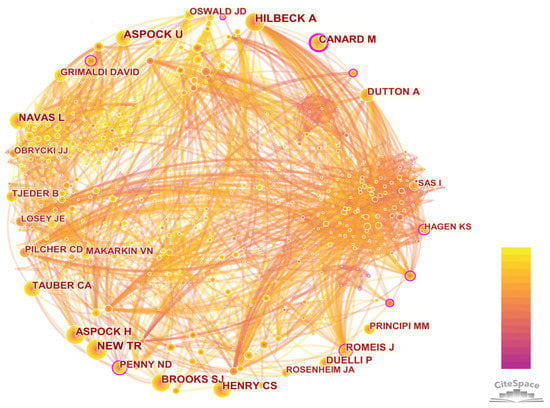 The network contained 548 authors and there were 3267 co-citation relationships (Figure 4). The top 10 authors in terms of frequency and centrality are presented in Table 3. The average citation frequency of individual authors was high. The top nine individuals were all cited more than 200 times, but the centrality was relatively low. The top five authors in terms of centrality were Yuyu Wang (0.23), Jörg Romeis (0.17), Michel Canard (0.15), Charles S. Henry (0.12) and Kenneth S. Hagen (0.1). It could be found that among them, the centrality was quite different. An analysis in terms of citation counts and centrality revealed that Michel Canard and Charles S. Henry were “core strength” researchers, whose research had important influences on this field. Michel Canard’s research fields were mainly about faunal analysis, biological control and behavior of Chrysopidae [41,42]. His most cited publication analyzed how lacewings adapt to seasonal changes [41]. Charles S. Henry’s research fields were mainly about species evolution and taxonomic identification of Chrysopidae, and whose most cited publications used song analysis, morphology and ecology characters to discover the true C. carnea [43].