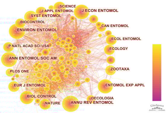 The journal co-citation network contained 169 journals and 635 connections (Figure 5). The most cited journal was the Annual Review of Entomology (815 citations), but it had a low centrality (0.01). The reason may be that the journal is a review journal, which focuses on illustrating the progress and future trends in the research field of Neuropterida, but it does not put forward new research methods. The second most cited was the Annals of the Entomological Society of America (789 citations), but its centrality was also not high (0.02). It indicated that the co-citations with other journals were relatively low. From the basic analysis, Biological Control and the European Journal of Entomology were not only the journals with a higher number of publications, but also the most cited ones. In addition, they were the most widely published journals on Neuropterida. The impact factor of each journal in 2021 is illustrated in Table 4. Most of the top ten journals, in regard to the number of publications, had low impact factors which were not proportional to the number of publications. It showed that there are few high-level publications in the field, thus more studies are needed to focus on the highlights according to other insects. The impact factor of the Annual Review of Entomology was significantly higher than other journals and was the most frequently cited, which may be due to the journal having a representative position in the field of entomology and being recognized by many scholars.