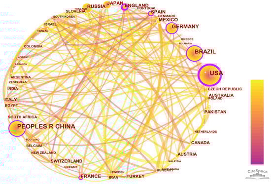 Country collaboration network. The node size represents the country’s publication frequency, and the connection line between nodes represents cooperation. High-centrality nodes are marked by a purple circle, which means the country has facilitated communication with other countries.