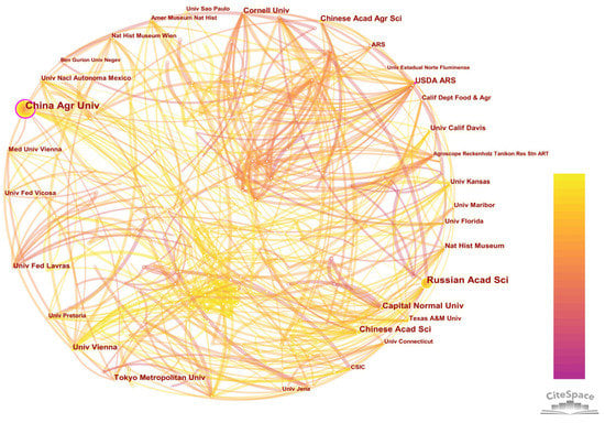 The institution collaboration network contained 537 institutions and 875 connections (Figure 7). Statistical data showed that most of the top 20 countries were agricultural countries (Table 6). The institution with the most publications was China Agricultural University and its first publication year was 2004. The earliest research of Neuropterida was the description of the Coniocompsa Enderlein (Coniopterygidae) in China [44]. China Agricultural University had a lot of cooperation with other institutions, whose research focused on the taxonomy and phylogeny of Neuropterida [10,45]. The early research on Neuropterida was mainly focused on the species identification and taxonomy [46,47]. With the development of science and technology, research of phylogenetic and evolution studies using modern techniques are more and more popular [10,48]. In addition, China Agricultural University has 201 publications, which are the most published publications in the field.