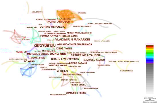 The author collaboration network in the research field of Neuropterida included 598 authors and 1032 connections (Figure 8). The early researchers were mostly individuals, and the cooperation was only between individuals. A representative was Catherine A. Tauber, whose main publication was “The genus Ceraeochrysa (Neuropterida: Chrysopidae) of America north of Mexico: Larvae, adults, and comparative biology” [52]. Modern research was often led by a small number of persons in charge, and a complex and close cooperation network was formed within the team. There was little cross-team communication, and the research teams were often composed by researchers from the same institution. Xingyue Liu, Vladimir N. Makarkin and Dong Ren were the top 3 authors that published the largest number of publications in the field of Neuropterida. Xingyue Liu ranked first in centrality (0.02) and published the most publications. Since 2004, Mario Waldburger had published only two publications on the Neuropterida, but his centrality was 0.01, indicating that his publications had important significance in recent years (Table 7).