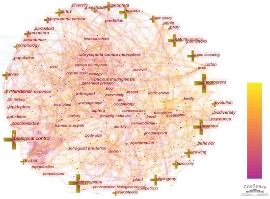 The keyword bursts can be analyzed based on the citation frequency. “Chrysoperla carnea” and “Cry1Ab toxin” became keywords during the period of the literature bursts in this field and continued for a long time (Table 10). In recent years, “Neuroptera Chrysopidae”, “Evolution”, “Burmese amber”, “Myanmar”, “Mesozoic”, “Genera”, “Mitochondrial genome” and “Fossil” had become the bursting keywords. “Neuroptera Chrysopidae”, “Genera”, “Evolution” and “Mitochondrial genome” had emerged as keywords mainly because the Chrysopidae was a representative species of Neuropterida, which had significant importance in biocontrol and defining its phylogenetic position. “Burmese amber”, “Myanmar”, “Mesozoic” and “Fossil” became a focus, due to Neuropterida being one of the most primitive groups of Holometabola. The study of its fossil record was of great significance to Holometabola and even Insecta.