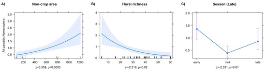 Models for the abundance of all collected parasitic Hymenoptera showed significant effects of season and local APM factors. The abundance of all PH collected increased with larger noncrop areas on the farm (Figure 1A). All PH abundance decreased with increased floral richness (Figure 1B). Despite an increase in collected PH in 2019 (2018, n = 872 and 2019, n = 1007), models that included season as an explanatory variable (early, mid, and late) and year (2018 or 2019) showed a significant overall decrease in PH abundance in late season (Figure 1C, z = −2.531, p = 0.011).