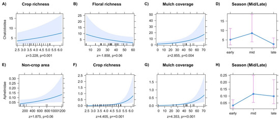 The Chalcidoidea and Aphelinidae showed significant responses in abundance to local explanatory variables. Final models for Chalcidoidea predicted both positive and negative responses in abundance to local factors, including increased abundance with increased crop richness (Figure 2A), and reduced abundance with increased on-farm floral richness (Figure 2B). Increased mulch coverage was associated with increased chalcidoid abundance (Figure 2C). Models for the family Aphelinidae showed significant effects from local variables, including increased abundance with increasing non-crop area (Figure 2E), crop richness (Figure 2F), and mulch coverage (Figure 2G). Chalcidoidea had a midseason increase (Figure 2D, z = 4.215, p ≤ 0.001), and late-season decrease in abundance (Figure 2D, z = −3.947, p ≤ 0.001). Aphelinidae abundance increased in both the mid (Figure 2H, z = 2.248, p ≤ 0.024), and late season (Figure 2H, z = 1.904, p = 0.056).
