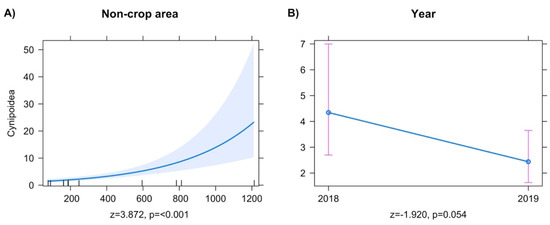 Final models for Cynipoidea showed an increase in abundance with a greater noncrop area (Figure 3A), and an overall reduction in abundance between 2018 and 2019 sampling periods (Figure 3B).