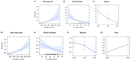 Final models for Braconidae showed a positive response in abundance to increased non-crop area (Figure 4A). Floral richness reduced braconid abundance (Figure 4B). Models for aphidiine abundance included local and temporal explanatory variables in the final model. Increases in the local factors’ non-crop area increased aphidiine abundance (Figure 4D). Floral richness reduced aphidiine abundance (Figure 4E). Aphidiine wasps had a lower abundance in the late season over both sampling years (Figure 4F, z = −2.841, p = 0.004), but generally had a greater abundance in samples during 2019 (Figure 4G, z = 2.13, p = 0.033). Across both sampling years, braconid abundance was reduced in both the mid (Figure 4C, z = −1.971, p = 0.048), and late season (Figure 4C, z = −4.615, p ≤ 0.001).