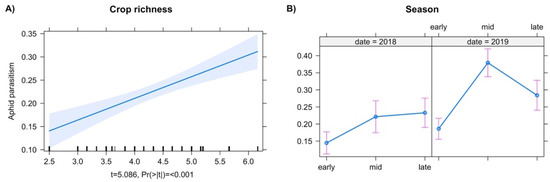 Predictor effect plots for individual explanatory variables. (A) Crop richness, (B) season and year on rates of parasitism.