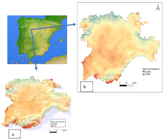 Map of the area of study (Castilla y León, NW Spain). (a) Altitude. (b) Medium annual temperature. Source: Atlas Agroclimático de Castilla y León—ITACYL-AEMET-2013 (http://atlas.itacyl.es, accessed on 24 April 2022).