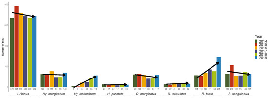 A total of 8143 ticks were collected over 6 years, of which 8081 were identified to the species level and life stage (larva, nymph and adult). The remaining 62 were discarded as their morphological identification was impossible due to the structural and conservation state in which they were received. Ixodid ticks belonging to five genera and eight species were found (Table 1); I. ricinus was the most frequent species infesting humans (52.29%), followed by R. bursa (12.15%), R. sanguineus s.l. (10.38%), Hy. marginatum (9.08%), D. marginatus (8.06%), Hy. lusitanicum (3.79%), D. reticulatus (2.48%) and H. punctata (1.73%). Although this general trend was maintained over the six years of the study, during recent years, there has been a clear increase in Hy. lusitanicum and Rhipicephalus bursa.