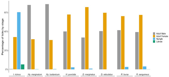 The adult stage (male and female) was the most frequent in all genera (Figure 3) except for Ixodes, where nymphs (60.31%) were collected in much larger numbers (Table 1). For Dermacentor, Haemaphysalis and Rhipicephalus, we observed a higher percentage of females compared to males and nymphs (64.24%, 57.85% and 56.72%, respectively) for all the species, while for Hyalomma species, the adults recovered were mainly males (68.20%). Larvae were recovered only from I. ricinus. This composition of females and males did not change throughout the study.