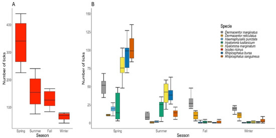 Seasonality of tick bites on humans. (A) I. ricinus. (B) D. marginatus, D. reticulatus, H. punctata, Hy. Lusitanicum, Hy. Marginatum, R. bursa and R. sanguineus. Species sampled by season and year: winter (December–February), spring (March–May), summer (June–August) and autumn (September–November).