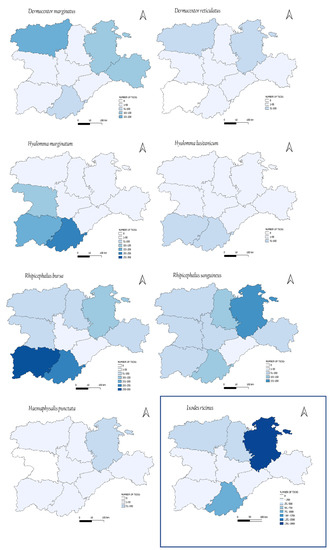 Almost all ticks were removed from all provinces of the community except for D. reticulatus and H. punctata. Ixodes ricinus showed a higher prevalence in the northeast, and both Dermacentor species in the northern areas, while Hyalommma spp. were detected mainly in the south. Rhipicephalus spp. showed differences in the distribution of the species, and R. bursa was mainly distributed in the south, while R. sanguineus was mainly distributed in the south and the northeast. Haemaphysalis was the less represented genus, mostly found in the northeast, with little or no presence in the other areas.