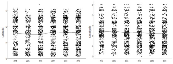 Looking at how the distribution of ticks has varied over the years by analyzing the latitude and longitude (Figure 6), we can see there was a tendency to move northwards and westwards when analyzing the data as a group. In the case of the longitude, this was statistically significant both at the group level (χ2: 19.422, df = 5, p < 0.05) and by year: 2018 compared with 2015 (Z: −3.175819; p-adjusted fdr < 0.05), 2019 compared with 2014 (Z: −2.879612; p-adjusted fdr < 0.05) and 2019 compared with 2015 (Z: −3.613219; p-adjusted fdr < 0.05). In the case of the latitude, this was statistically significant only at the group level (χ2: 13.895, df = 5, p < 0.05).