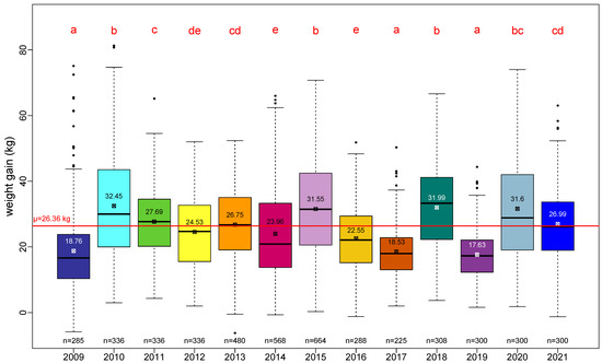 The range of annual variations of the total weight gain is clearly depicted in Figure 2. A pairwise Student test showed four classes of performance: