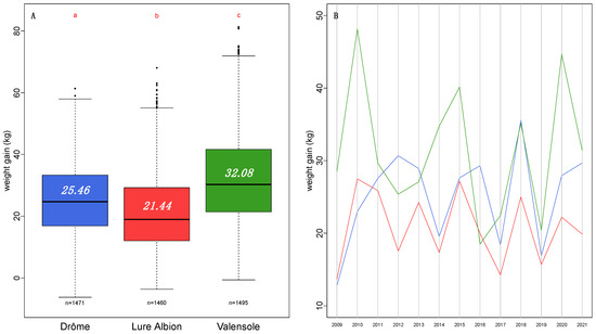 On average, the total weight gain is about 3.87 ± 1.2 kg higher in the Drôme region than in the Lure Albion region and higher by 6.7 ± 1.2 kg in the Valensole region than in the Drôme region.