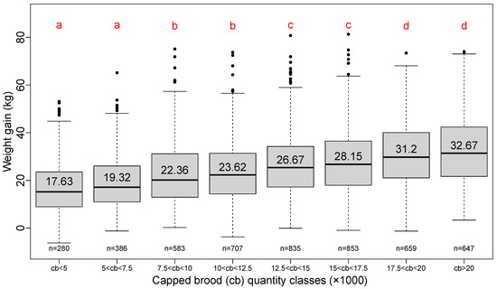 Boxplot series of eight classes of capped brood quantity. Step of increase: 2500 cells of capped brood. Red letters result from a pairwise Student test (p-value < 0.05). Number in each box plot is the average total weight gain for that class. Number “n=” below each box plot is the number of hives surveyed for that class. Annual variations are shown in Appendix A: Figure A1.