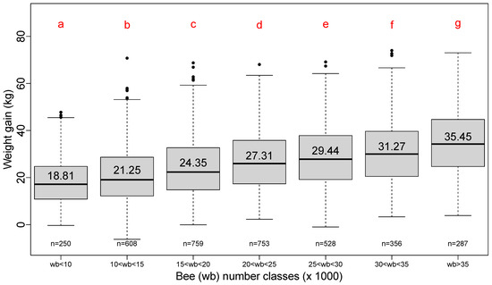 Boxplot series of seven classes of honey bee numbers. Step of increase: 5000 bees. Red letters result from a pairwise Student test (p-value < 0.05). Number in each box plot is the average total weight gain for that class. Number “n=” below each box plot is the number of hives surveyed for that class. Annual variations are shown in Appendix A: Figure A2.