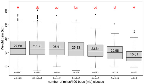 Boxplot series of seven classes of number of mites/100 bees. Unequal step of increase. Red letters result from a pairwise Student test (p-value < 0.05). Number in each box plot is the average total weight gain for that class. Number “n=” below each box plot is the number of hives surveyed for that class.