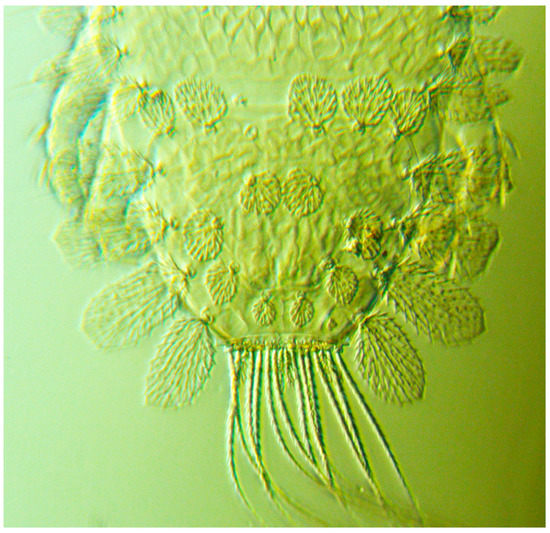 Peacock mites are easily recognized by their outstanding broadly flattened dorsal setae that are usually white in colour and ovate to obovate in shape (i.e., leaf-like in appearance), in conjunction with their striking “tail” setae. Tuckerella pavoniformis is separated from other peacock mite species by having six pairs of elongate flagellate caudal setae equal in length (h2, h3, h4, h5, h7, h8) and two pairs of short broad ovate setae (h1 and h6); dorsal cuticle in the pygidial region with mostly regular reticulations; and setae f2 larger than, and inserted anterior to, setae f1 (Figure 4).