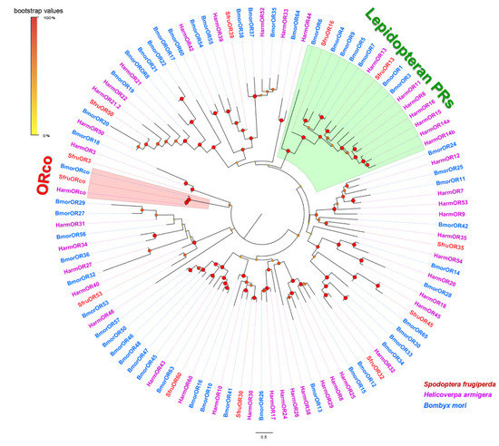 A phylogenetic tree indicating evolutionary relationships of ORs between S. frugiperda and the selected Lepidopteran species B. mori and H. armigera was constructed. The results showed that ORco genes from the three species were highly conserved and clustered in one branch. Two ORs in S. frugiperda, including SfruOR13 and SfruOR16, clustered in the lepidopteran PR clade [55,56] (Figure 1).