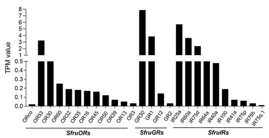 The expression levels of the 26 candidate chemosensory receptor genes were normalized across sequencing libraries using the TPM scaling factor. TPM values of the SfruORs indicated that SfruOR53 was the most abundantly expressed OR (3.23 TPM) in the PG-OV of S. frugiperda. Two candidate PRs, SfruOR13 and SfruOR16, showed relatively low expression levels, with TPM values of 0.05 and 0.17, respectively. Most importantly, SfruORco was also detected, but its TPM value was very low (0.02) (Table 1, Figure 2).