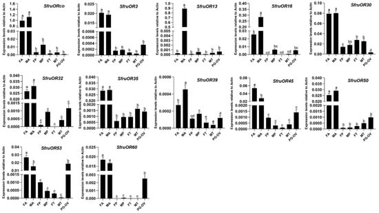 Expression patterns of candidate ORs in different tissues of S. frugiperda. RT-qPCR analysis of candidate OR genes was carried out in female antennae (FA), male antennae (MA), female proboscises (FP), male proboscises (MP), female tarsi (FT), male tarsi (MT), and the female pheromone gland-ovipositor (PG-OV). Values are means + SE; in each panel, means with different letters are significantly different according to a one-way ANOVA followed by Tukey’s multiple comparison test (p < 0.05, n = 3).