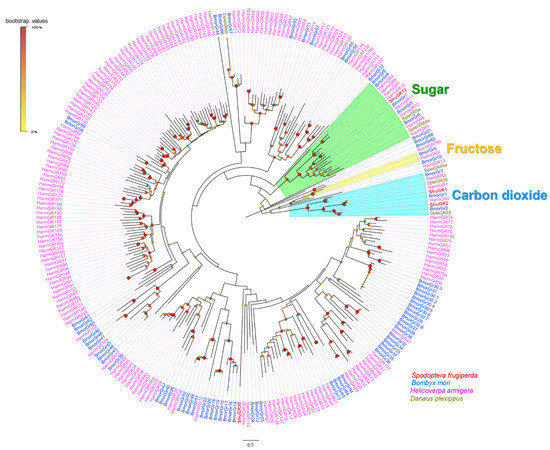 A phylogenetic tree constructed with GR sequences from S. frugiperda, H. armigera, and B. mori was used to infer the functions of the candidate genes. SfruGR1 and SfruGR2, which grouped with HarmGR1/2/3 and BmorGR1/2/3, were putative candidate CO2 receptors [66,67]. SfruGR12 clustered with the BmorGR4/5/6/7/8 lineage, which detects sugar in B. mori [68]. One GR, SfruGR30, clustered in the clades containing putative bitter-taste receptors (Figure 4).