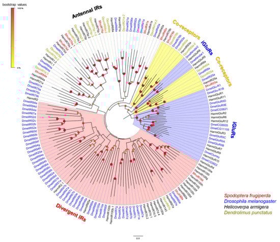 A phylogenetic tree was constructed to indicate evolutionary relationships between S. frugiperda IRs and a selection of those from D. melanogaster, H. armigera, and D. punctatus (Figure 6). The putative IR co-receptors of S. frugiperda, SfruIR25a and SfruIR76b, clustered with the highly conserved co-receptor lineages of DmelIR25a and Dmel76b, respectively. Other than SfruIR60a and SfruIR100, which were in the “divergent IRs” clade, the other SfruIRs (SfruIR40a/41a/64a/75d/75p/75q.1) were in the putative “antennal IR” clade (Figure 6).