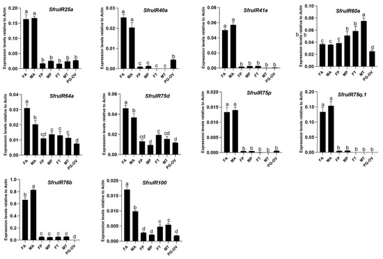 According to the RT-qPCR results, two GR genes, SfruGR2 and SfruGR30, were mainly expressed in the female PG-OV and in the proboscis of both sexes, and their expression was significantly higher in the female PG-OV and in the proboscises of both sexes than in the antennae and tarsi (p < 0.05). Although SfruGR1 was enriched in proboscis and the female PG-OV, it was also highly expressed in the female antennae. In contrast, the expression of SfruGR12 was significantly higher in female antennae than in other tissues (Figure 5).