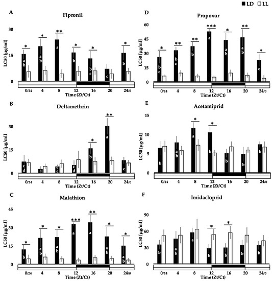 Exposure to continuous light affects daily susceptibility patterns and results in increased sensitivity to insecticides in larvae (the flowchart of the experiment is shown in Scheme 1A). The 2-day-old larvae of the 6th instar were exposed to fipronil (A), deltamethrin (B), malathion (C), propoxur (D), acetamiprid (E), and imidacloprid (F) at various concentrations for one hour at a given time point. Data are shown as the average LC50 (±SEM) at 24 h after exposure to insecticides for larvae kept under LD (black bars) and LL (white bars) conditions in three independent experiments. Significant differences between LD and LL mean values at a given time point, with * p < 0.05, ** p < 0.01, and *** p < 0.001, were calculated by ANOVA and unpaired t-test. Differences between time point mean values within LD and LL groups were determined by an ANOVA and Bonferroni post-test; different letters inside the bars denote significant differences at p < 0.05. Horizontal bars represent day (white) and night (black) portions of the photo-regime with Zt (Zeitgeber time)/Ct (Circadian time) indicated below.