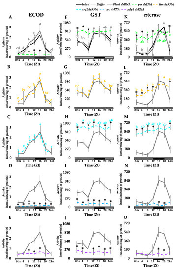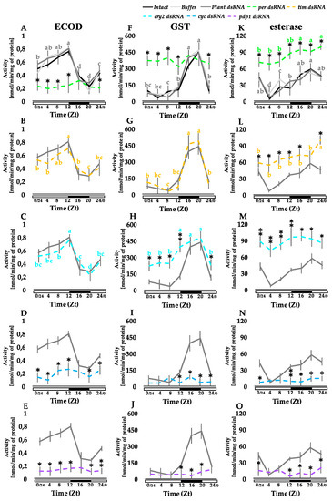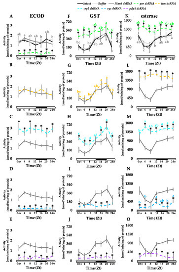 Changes of the daily patterns in the activity of xenobiotic metabolizing enzymes in the midgut caused by RNAi-mediated disruption of clock gene expression. The activities of ECOD (A–E), GST (F–J), and esterase (K–O) were analyzed in the fat body of the larvae whose molecular oscillator was altered by injection of clock gene dsRNA (as in experiments whose results were presented in Figure 2). Statistical analyses of the obtained data and the results presentation on the graphs are analogous to those described in Figure 2.