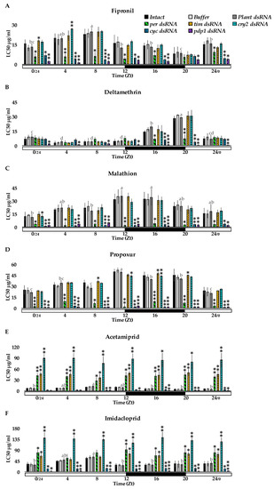 RNAi-mediated disruption of clock genes expression affects daily susceptibility patterns and results in increased larvae sensitivity to insecticides (the flowchart of the experiment is shown in Scheme 1B). The 2-day-old larvae of the 6th instar were exposed to fipronil (A), deltamethrin (B), malathion (C), propoxur (D), acetamiprid (E), and imidacloprid (F) at various concentrations for one hour at given time points. Data are shown as the average LC50 (±SEM) at 24 h after exposure to insecticides for larvae injected with clock genes dsRNAs (green bars with diagonal lines for per, orange bars with wavy lines for tim, turquoise bars with horizontal lines for cry2, light blue bars with square grid for cyc, and purple bars with dots for pdp1) and in larvae which serve as controls: untreated (Intact—black bars), injected with buffer used for in vitro transcription (Buffer—light gray bars), or SSU dsRNA of N. tabacum (Plant dsRNA—dark gray bars). Values with different letters for the data of the Intact group differ significantly (p < 0.05), as calculated by an ANOVA and Bonferroni post-test. Significant differences between mean values for larvae treated with clock gene dsRNA and from control groups in the given time points were calculated by an ANOVA and unpaired t-test; comparisons between the groups treated with the dsRNA of the clock genes and the Plant dsRNA, with * p < 0.05, ** p < 0.01, and *** p < 0.001 (labeled above the bars that indicate data for clock gene dsRNA-treated insects) are shown.