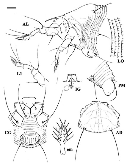 Line drawings of a deutogyne of Aculus mosoniensis. AD: prodorsal shield; AL: lateral view of anterior body region; CG: female coxigenital region; em: empodium; IG: internal female genitalia; LO: lateral view of annuli; L1: leg I; PM: lateral view of posterior opisthosoma. Scale bar: 10 μm for AD, AL, CG, IG, and PM; 5 μm for LO and L1; 2.5 μm for em.