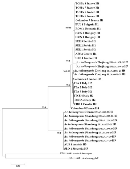 Maximum likelihood phylogenetic tree of Aculus mosoniensis ITS1 sequences, Aculops taihangensis, and one congener, Aculus cercidis, used as outgroup. Only significant values of bootstrap support (>90%) and of Bayesian posterior probabilities obtained by MrBayes (>0.9) are shown at the nodes. The scale bar indicates the expected number of substitutions per site. Tips labels refer to specimen IDs and haplotypes listed in Table 1.