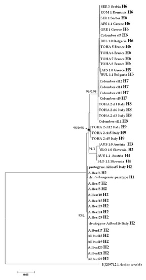 In the ITS1 alignment generated from all analyzed specimens, due to the presence of indels, sequences varied in length from 440 bp (Colombes in France) to 449 bp (Austria and Slovenia), while ITS1 was 447 bp long in Ac. taihangensis paratype (Table 1). A total of nine haplotypes were recovered and the most common haplotype H6 was shared between five European countries (Figure 6).