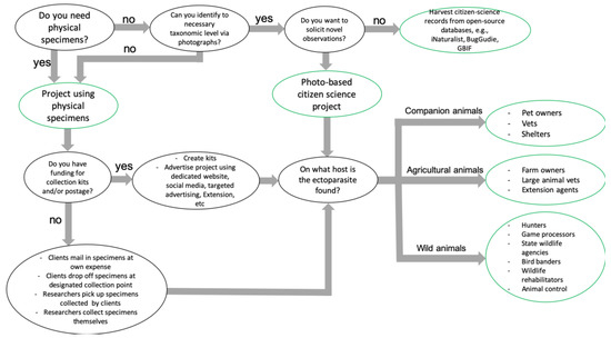 A flowchart of considerations and questions related to ectoparasite collection, animal populations, and target audiences while planning a citizen science program focused on ectoparasite sampling from animal hosts.