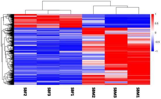 Using the FPKM-mapped reads method, and with our assembled transcriptome as a reference, genes expressed in males and females were identified. DEGs with a >2 fold change and FDR < 0.05 were defined as significant sex-biased (SB) genes. Of the 11,121 DEGs identified, 8986 DEGs exhibited relatively higher expression levels in males than females, and they were considered to be male-biased genes (Table S3), while 2135 DEGs showed higher expressions in females, and they formed the female-biased genes (Figure 1 and Figure 2; Table S4), based on previous criteria [10].
