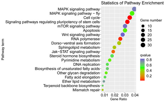 In order to further elucidate the pathways in which the sex-biased genes participate, we performed KEGG analysis on the 8986 male-biased genes and the 2135 female-biased genes. Many female-biased genes were attributed to pathways related to the cell cycle, wnt signaling pathway, MAPK signaling pathway, dorso-ventral axis formation, DNA replication and RNA polymerase, etc. (Figure 3). Furthermore, these genes involved in the above-mentioned pathways have been reported to have direct or indirect effects on insect sex determination and differentiation.
