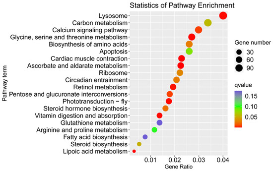 A large number of male-biased genes can be attributed to pathways associated with glycine, serine and threonine metabolism, vitamin digestion and absorption, pentose and glucuronate interconversions, the biosynthesis of amino acids, carbon metabolism, arginine and proline metabolism, and glutathione metabolism (Figure 4). These metabolic pathways may provide energy for the development and reproductive behaviour of males.
