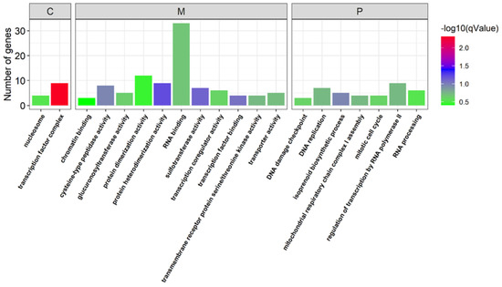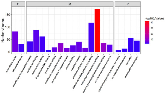 Gene ontology classification of the male-biased genes. C: cell component; M: molecular function; P: biological process.