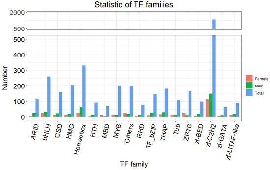 Moreover, we found that a number of transcription factors (TFs)—such as c2h2, homeobox, bhlh and thap—were differentially associated with male and female borers, implying their role in sex determination and differentiation (Figure 7; Table S5). Interestingly, more TFs were male-biased than female-biased.