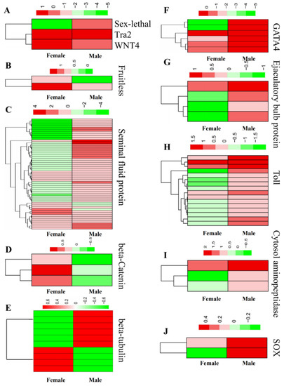Expression of sex-determining genes in male and female borers. The different horizontal bars represent different gene IDs with the same annotation. The red and green colours indicate increased and decreased gene expression levels, respectively, following the quantitative scale (+ve and -ve numbers) shown above each heatmap. In each heatmap, the left and right columns represent the gene expressions in female and male adults, respectively. The expression patterns of sex-lethal, tra2 and wnt4 (A), fruitless (B), seminal fluid proteins (C), beta-catenin (D), beta-tubulin (E), gata4 (F), ejaculatory bulb-specific protein (G), toll (H), cytosol aminopeptidase (I) and sox (J) in the female and male adults.
