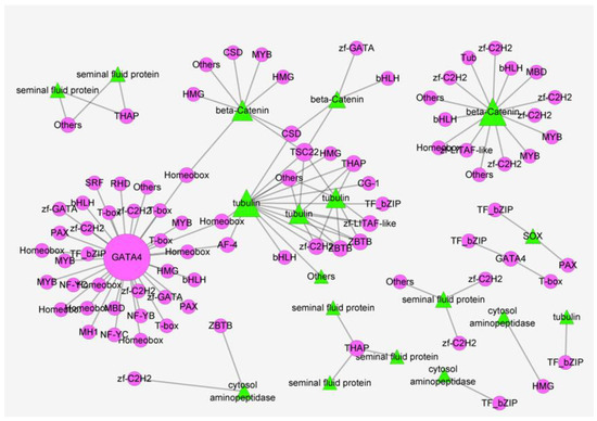 In order to explore the interaction network among sex determination and differentiation-related genes in sugarcane borer, we performed a protein–protein interaction (PPI) network analysis using the STRING database [55] and Cytoscape [56] on the 110 sex determination and differentiation genes and the TFs identified in this work. The PPI network contained 296 nodes and 104 edges. According to the PPI network, six genes (degree ≥7) were selected as hub genes, including gata4 (Unigene10060_All), beta-tubulin (Unigene7114_All/CL2807.Contig1_All/Unigene14411_All) and beta-catenin (CL2862.Contig1_All/CL4096.Contig1_All). Among them, gata4 had the highest degrees (with the most connected genes), suggesting that it may play a crucial role in sex determination and differentiation in sugarcane borer. In addition, some TFs—including myb, bhlh and homeobox—were also present in the PPI network, indicating their involvement in sex determination and differentiation in C. sacchariphagus (Figure 9).